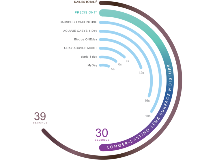As lentes de contato PRECISION1™ demonstraram estabilidade superior da hidratação da superfície da lente em relação às lentes de contato da concorrência8-11*.