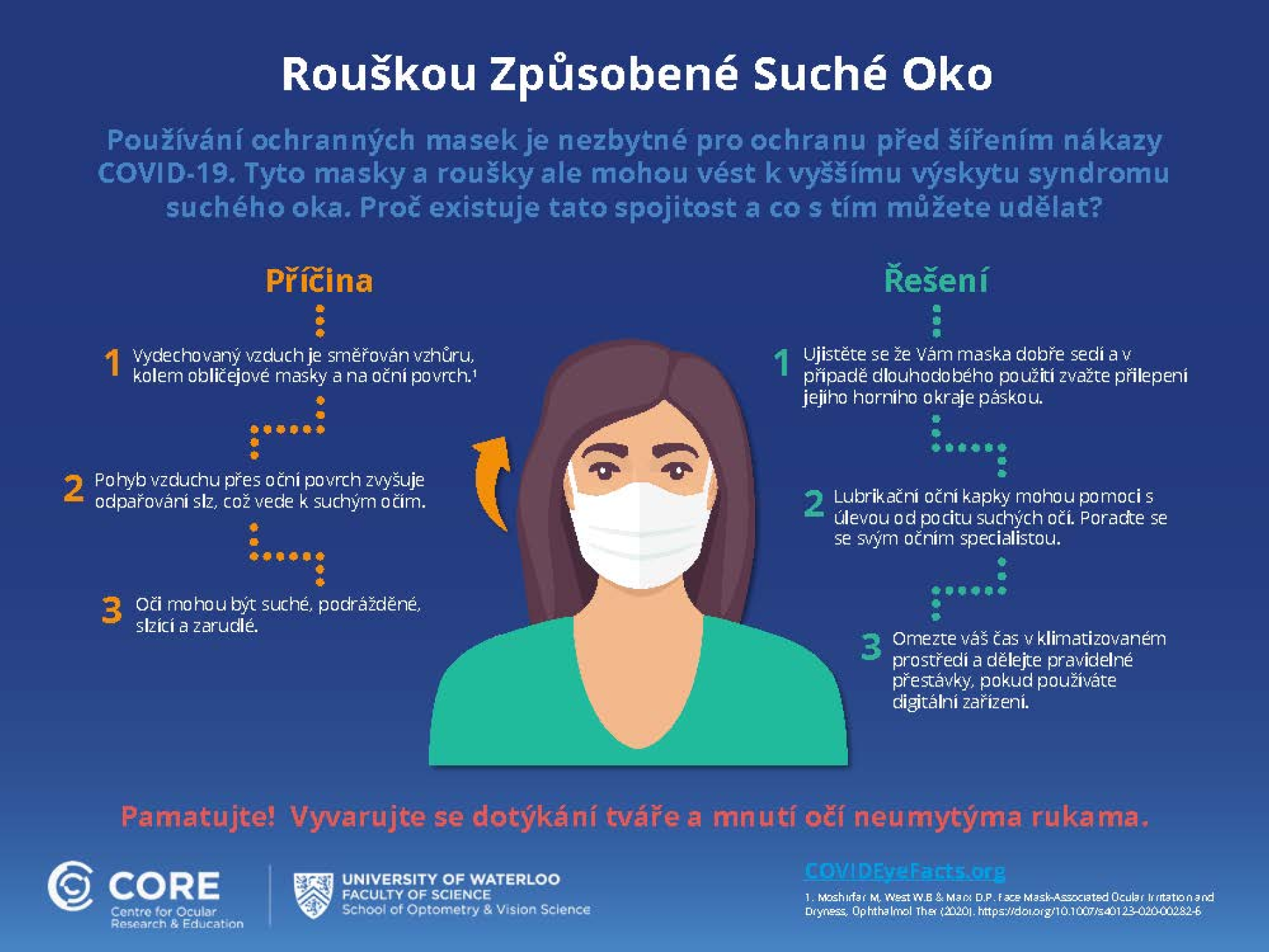 V této složité době, kterou ovlivňují opatření proti virovému onemocnění Covid-19, vede k rozvoji příznaků suchého oka nejen delší čas strávený u obrazovek digitálních zařízení. Plakát níže, navržený Společností pro oftalmologický výzkum a vzdělávaní, který sdílíme se souhlasem uvedené organizace, znázorňuje tuto problematiku. Navíc by mohl být skvělou edukační pomůckou pro vaši ordinaci. Navštivte stránku COVIDEyeFacts.org, kde si můžete vyhledat plakát přeložený do různých jazyků.