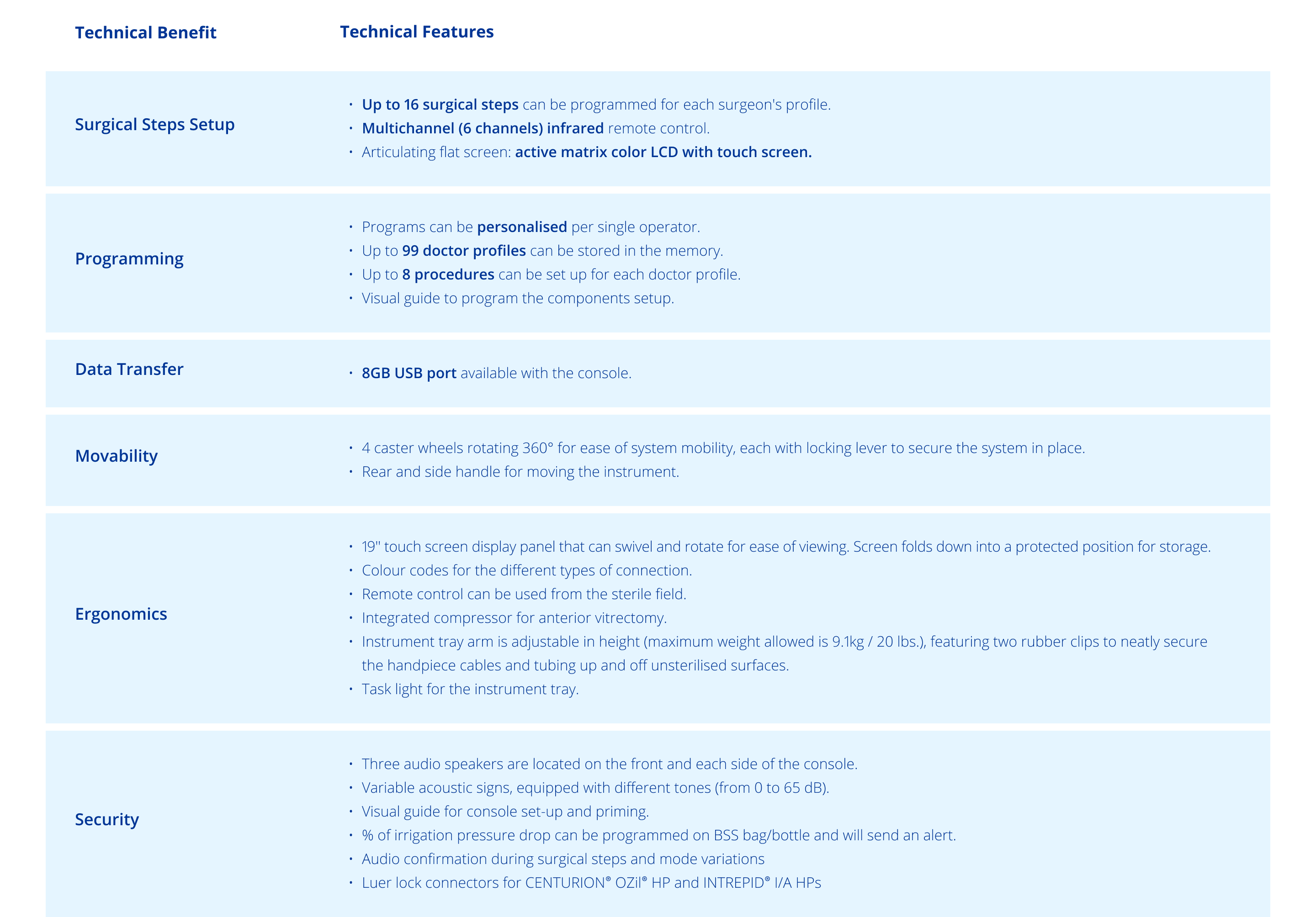 CENTURION® Silver System’s intuitive graphic user interface enables quick adjustment and enhanced customisation of surgical parameters and settings.1