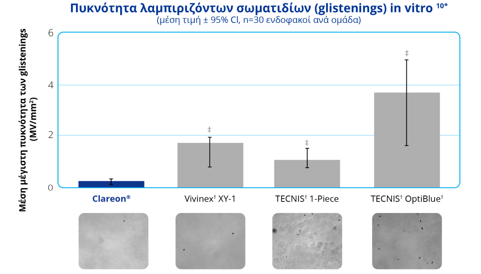 Σε μια in vitro μελέτη, οι ενδοφθάλμιοι φακοί Clareon® παρουσίασαν χαμηλότερα επίπεδα λαμπιριζόντων σωματιδίων (glistenings) σε σύγκριση με τους TECNIS† και Vivinex†.10‡