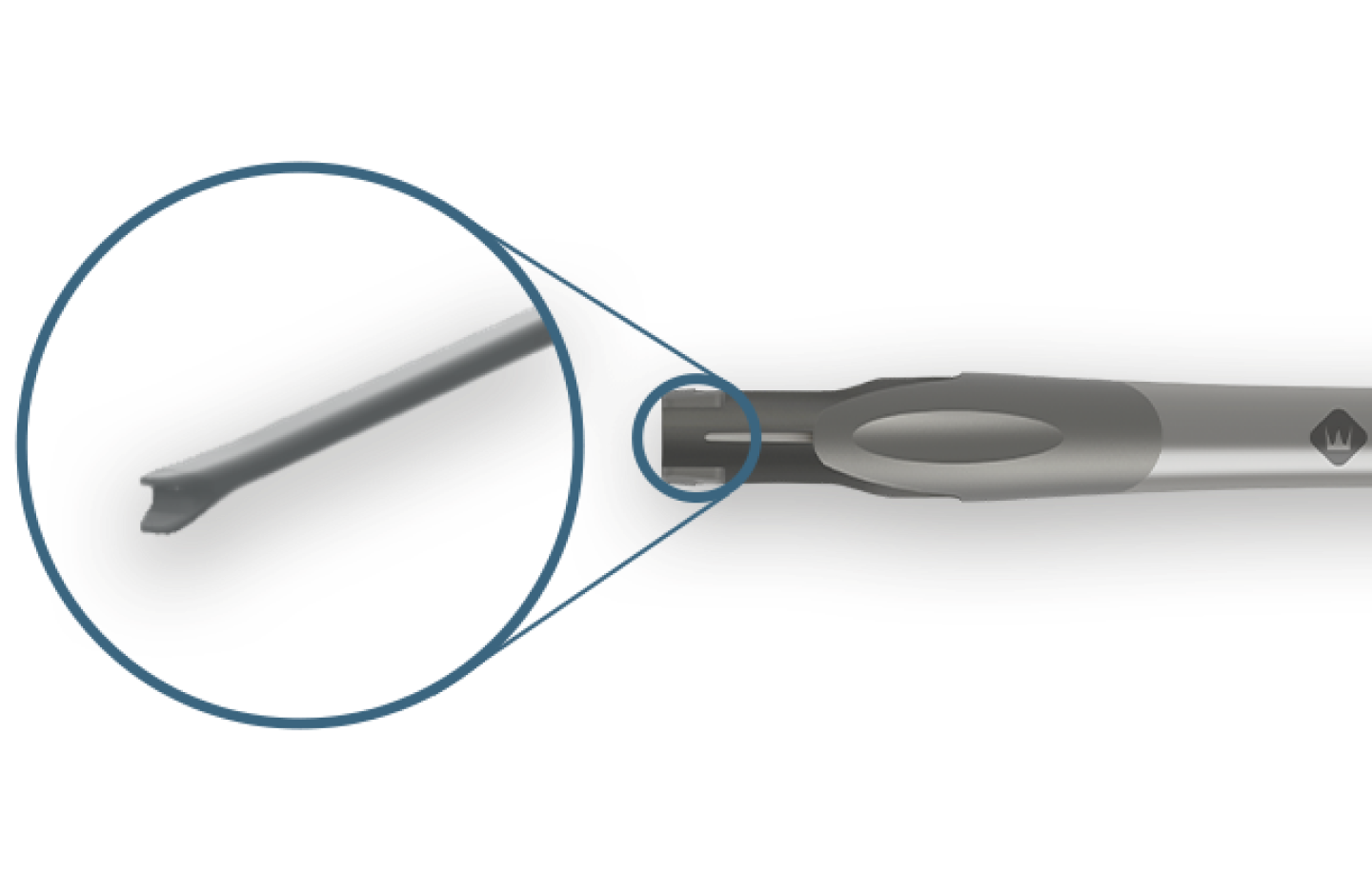 Allows a better grip, easier to find by feel under the microscope, and designed to reduce rotations during IOL delivery.