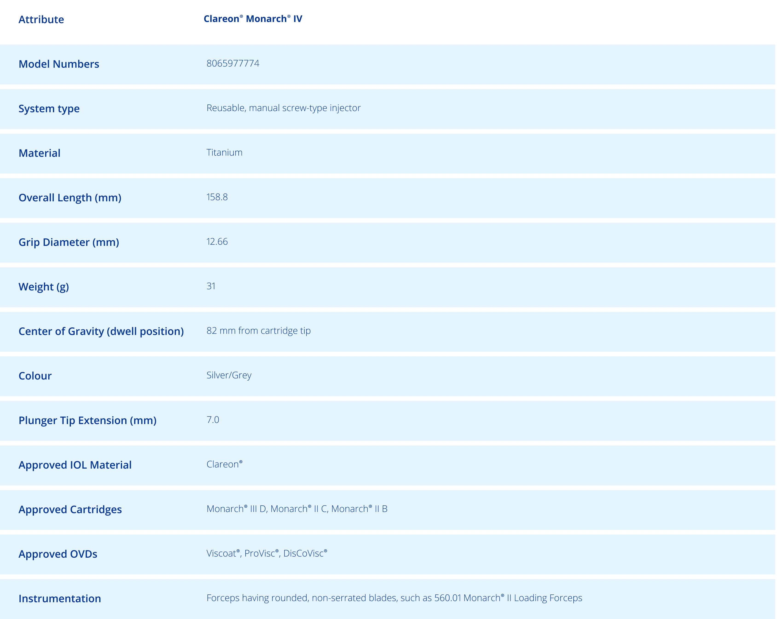 Clareon® Monarch® IV provides a seamless manual IOL delivery experience with an ergonomic design that improves consistency, control and is easy to use.1,2