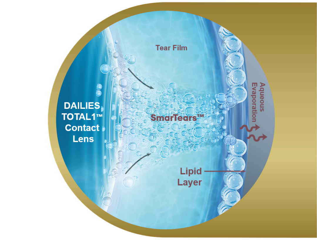 Thanks to SmarTears™ Technology and Water Gradient material, DAILIES TOTAL1™ contact lenses demonstrated LONGER LENS-SURFACE MOISTURE BREAKUP TIME4-6**
