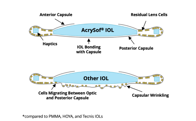 - Unique AcrySof® IQ hydrophobic acrylic material provides the highest bonding with the capsule compared to competitor IOLs.