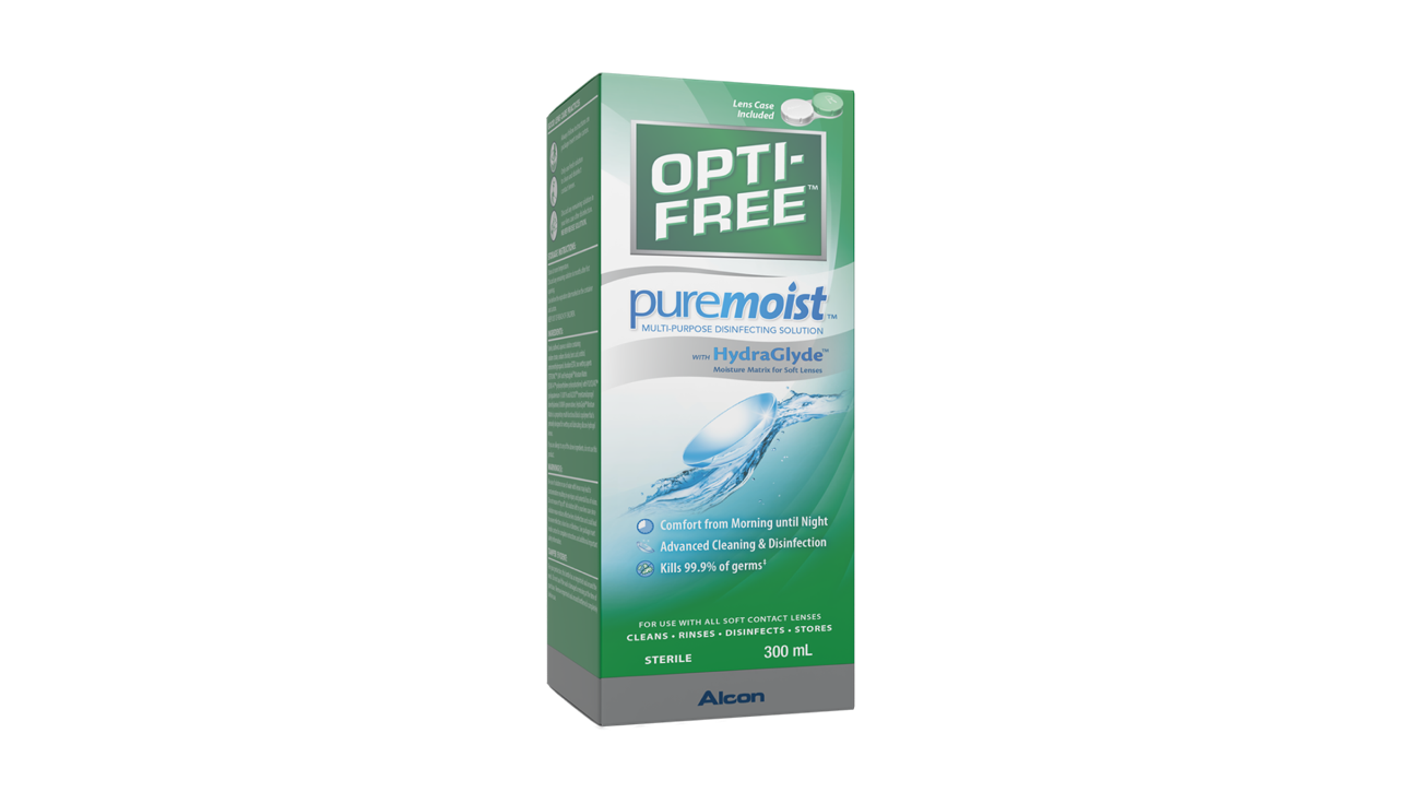 A multi-purpose disinfecting solution with HydraGlyde® Moisture Matrix that cleans, re-conditions, rinses, disinfects, removes lipids and proteins and stores soft contact lenses.OPTI-FREE® PureMoist® has been optimised for silicone hydrogel contact lenses1-3.